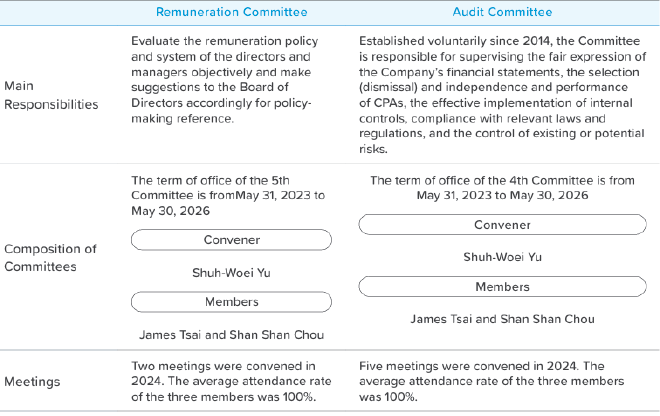 The Board of Directors of ECOVE is the Company's highest decision-making body, responsible for overseeing the Company's operations and formulating major strategies. To ensure sound corporate governance, we have established an Audit Committee https://air.writepath.co/dispatchjob/list/mine and a Remuneration Committee under the Board of Directors, which are responsible for overseeing the Company's finances and compensation system, respectively. Additionally, an internal audit organization has been set up to manage the planning and execution of audit operations. The unit not only reports on audit activities to the independent directors on a regular basis but also attends meetings of the Audit Committee and the Board of Directors to provide reports.