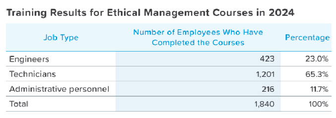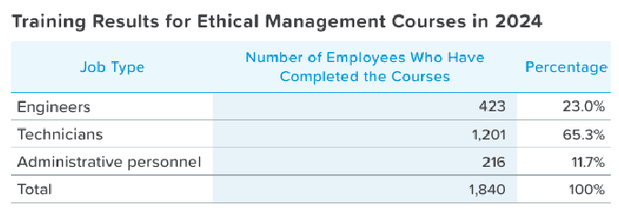 To continuously strengthen the commitment to ethical management, the Company has incorporated "ethics" as part of the annual performance evaluation criteria for all employees, accounting for 5% of the performance evaluation metrics. This aims to deepen the connection between ethics and positive employee behaviors. Additionally, each year, the Company organizes both internal and external activities and training sessions related to ethical management for all employees. In 2024, two online ethical corporate management courses were conducted for all employees, with a total of 1,846 participants in both sessions. The number of employees who completed the courses was 1,840, representing 99.6% of all employees; the 0.4% of employees who did not complete the training was due to their resignations during the training period. In addition, the education and training program for new recruits also includes courses related to ethics and integrity, such as Code of Conduct, Code of Ethical Conduct, and Business Secrets, and the participation rate is 100%. The total number of training hours for the above related courses is 2,767. All Board Directors also underwent courses related to ethical corporate management issues, and advocacy was further conducted on the issues of legal compliance, avoidance of interest, improper political contributions and donations, with a completion rate of 100%, thereby strengthening the concept of ethical management at the governance level.