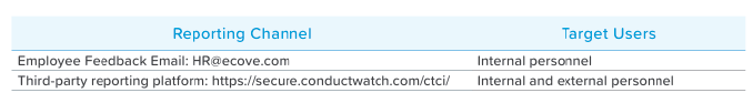 In response to reporting-related operations, ECOVE has established the "Whistleblowing Operation Management Measures." These measures are not only available on the Company's internal employee The Human Resources Department is responsible for handling whistleblowing cases and providing initial review recommendations. The cases are then forwarded to the Group Shared Services (GSS) for further investigation, ensuring a transparent whistleblowing channel and fair investigation process. Internal and external personnel who discover any violations of laws, regulations of the Company, or other improper conduct that may affect the interests of the Company may freely choose to report such incidents either by providing their names or anonymously. Internal whistleblowers wishing to file a report may do so through the Employee Feedback Platform's employee mailbox (HR@ecove.com) or by utilizing the reporting website established by the third-party impartial organization, KPMG Taiwan, to protect the rights of the whistleblower and ensure that the reported cases are properly investigated and addressed.