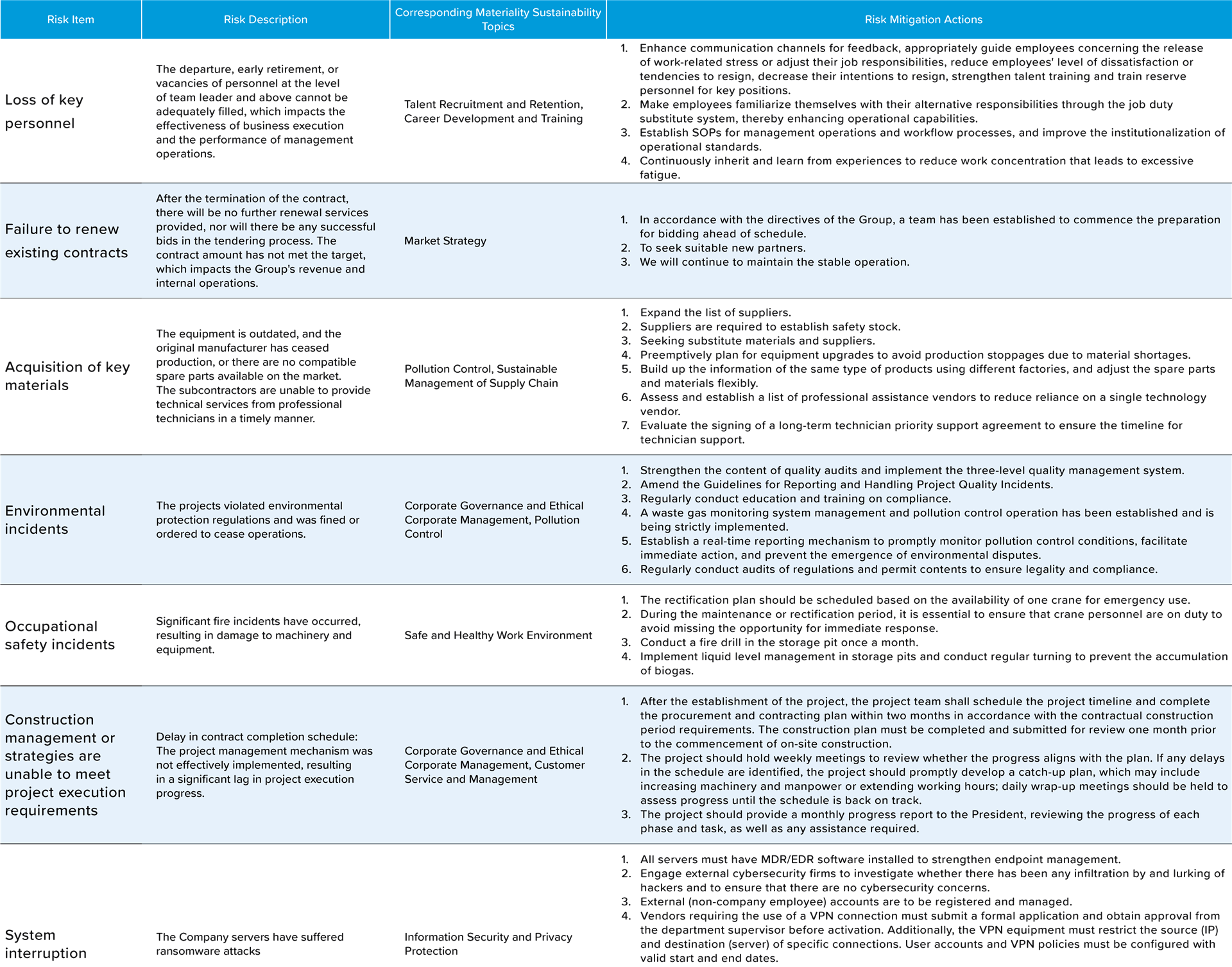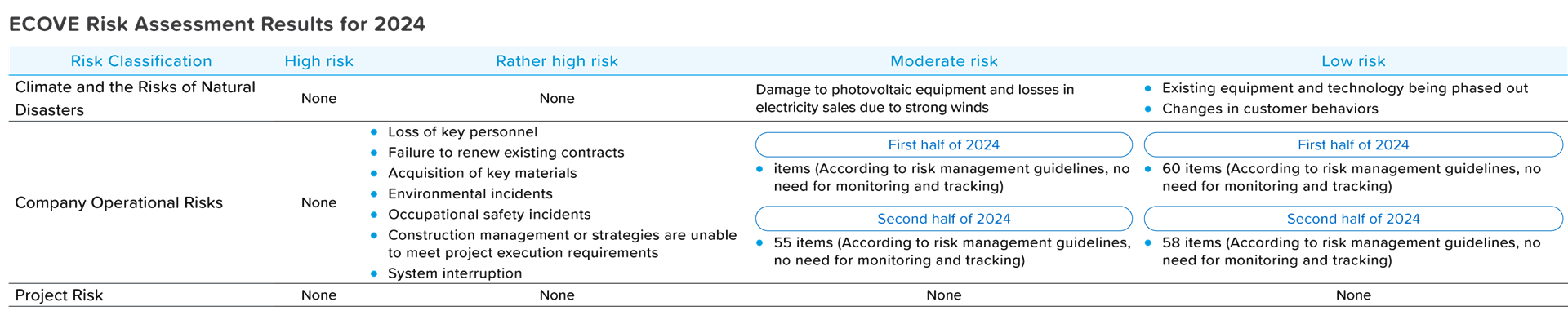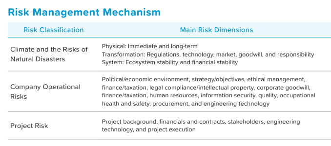 ECOVE categorizes risks into three main types: climate and natural risks, operational risks, and project risks. To mitigate the operational impacts caused by internal and external uncertainties, a comprehensive risk management process is implemented. This process includes systematic risk identification, risk analysis, risk assessment, and response measures to address and manage risks that may pose threats (or opportunities) to the Company. The aim is to avoid or reduce the impact on operations. All employees are also responsible for identifying and reporting risks. If any significant risk events that may affect the Company's operations are discovered, they should be reported immediately to their respective supervisors.