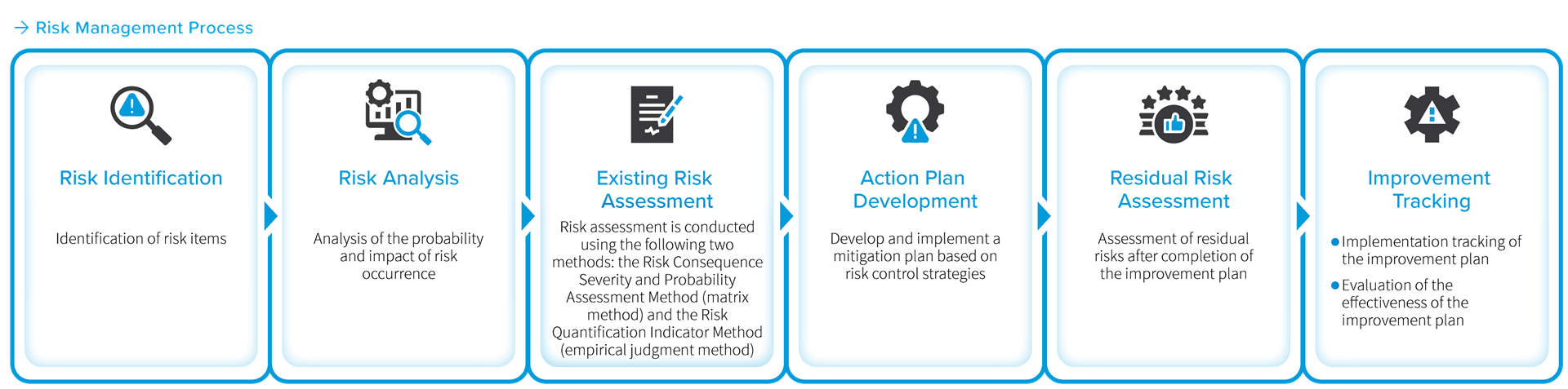 Each risk management unit shall conduct risk identification, risk analysis, risk assessment, and risk controlprocesses at least once every six months. This includes identifying potential risks that the Company may face within its business scope, analyzing the degree of impact and probability, selecting appropriate risk control measures based on each identified risk, and formulating mitigation strategies. The findings shall be submitted to the Risk Management Executive Committee for review to assess the effectiveness of risk control measures and action management, and to continuously monitor the status of risk improvement.