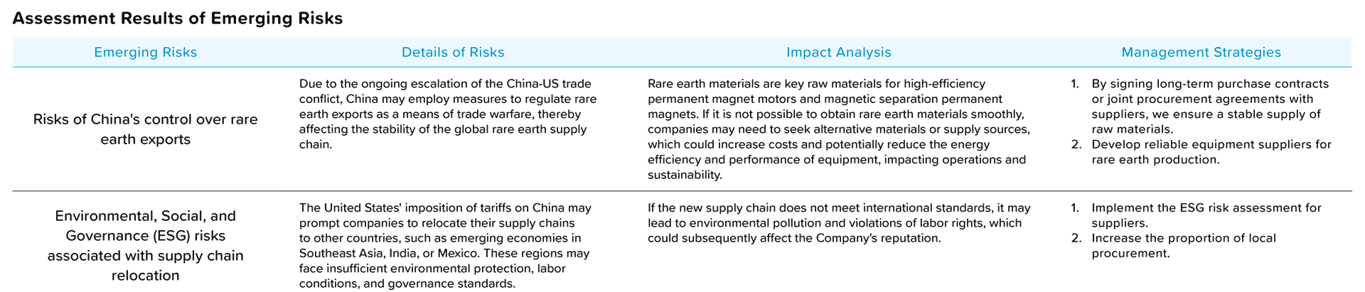 According to the scope covered by the risk management framework, in the assessment results for 2024, ECOVE has identified the following seven major high-risk items: