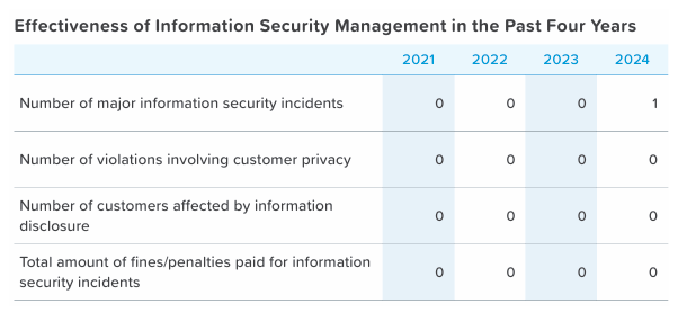 According to the "Information Security Management Guidelines," if employees detect a computer virus intrusion or other malicious software, they should immediately notify the nearest Information Center or the computer administrator of their department for handling. In practice, when the Information Service Center receives notifications from the antivirus system (indicating that automatic cleaning or isolation has failed), they proactively intervene to prevent individual employees from neglecting the antivirus system's alarm notifications. In 2024, there were 0 warnings or notifications of computer virus infection, 0 automatic cleanups, 0 automatic quarantine, and 25 notifications of information security incidents, which did not result in any data loss or customer damage. However, internal education training has been held to address the potential risk factors associated with the reported incidents. In the future, we will continue to refine and review the relevant processes to comprehensively improve the management of information security and align with the international quality requirements.
