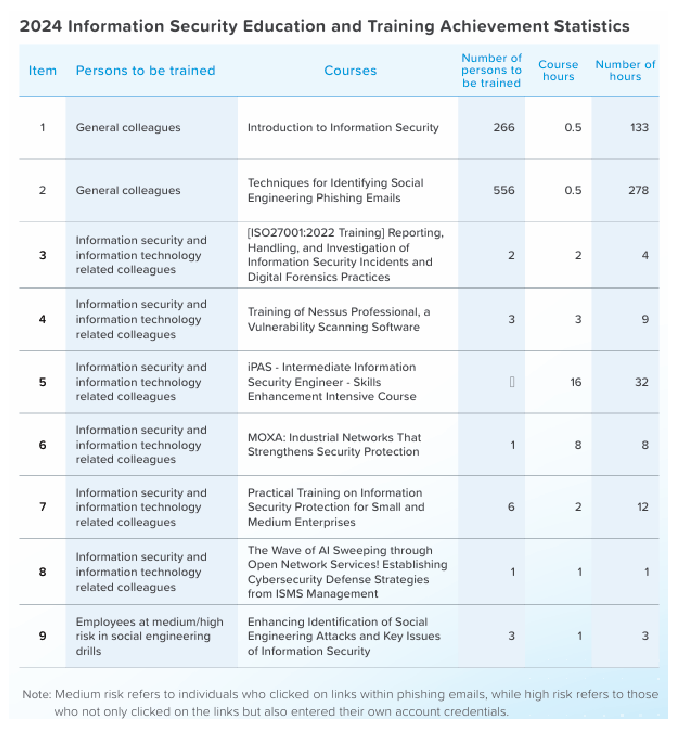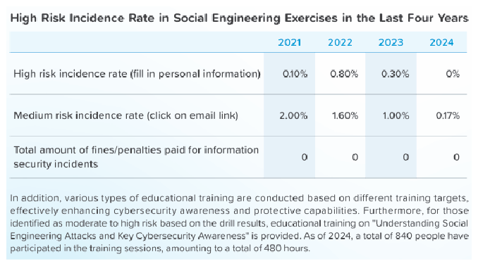 To enhance employees' understanding of the importance of information security, improve their awareness of security issues and emergency response capabilities, and effectively manage risks, we continue to promote social engineering drills and conduct these drills every quarter. According to the results of the