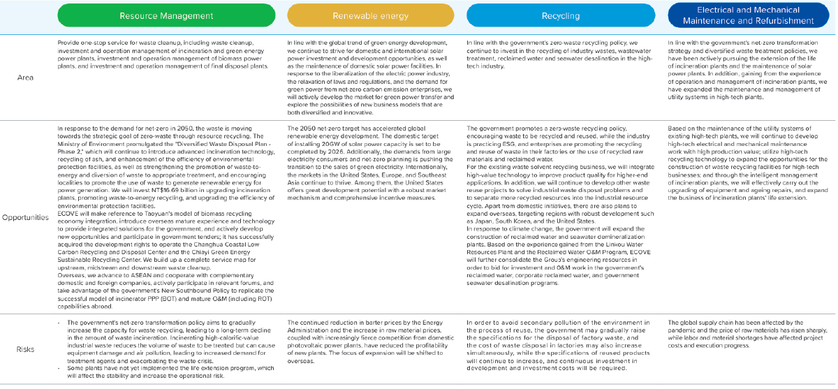 n 2024, ECOVE continues to integrate SDGs, deepens the domestic market, expands overseas presence, and strives for more project collaboration opportunities. Additionally, we respond to the development trend towards a circular economy model in the market by actively expanding operations in waste resource utilization to enhance resource cycling efficiency. Leveraging our core capabilities and existing business expansion, we will continue to deepen our presence in the areas of "resource management," "recycling," "renewable energy," and "electrical and mechanical maintenance and refurbishment," showcasing Taiwan's technical expertise and strength in the resource cycling industry to the world.
