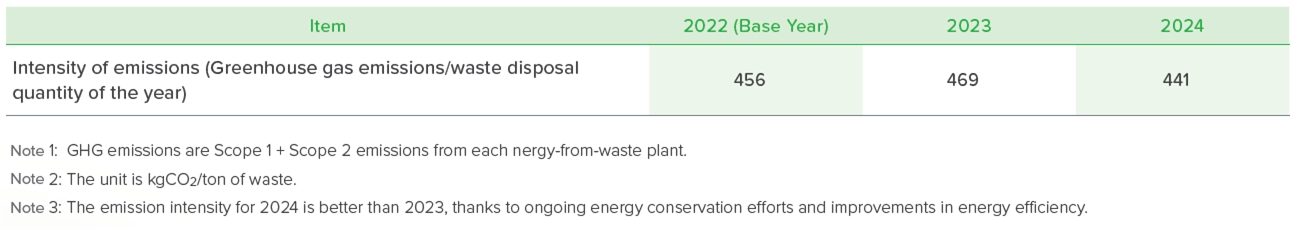 ECOVE Environment Service Corp. cooperated with the Group to conduct an organizational greenhouse gas inventory of nergy-from-waste plants managed by the Group in 2022, to determine the emissions of each emission source, and then continue to improve energy conservation and energy efficiency, and set 2022 as the base year to control the intensity of emissions. The emission intensity for 2024 is 441 kgCO2/t, representing a reduction of approximately 3.3% compared to the base year of 2022. This decrease is primarily attributed to ongoing energy conservation efforts and improvements in energy efficiency.
