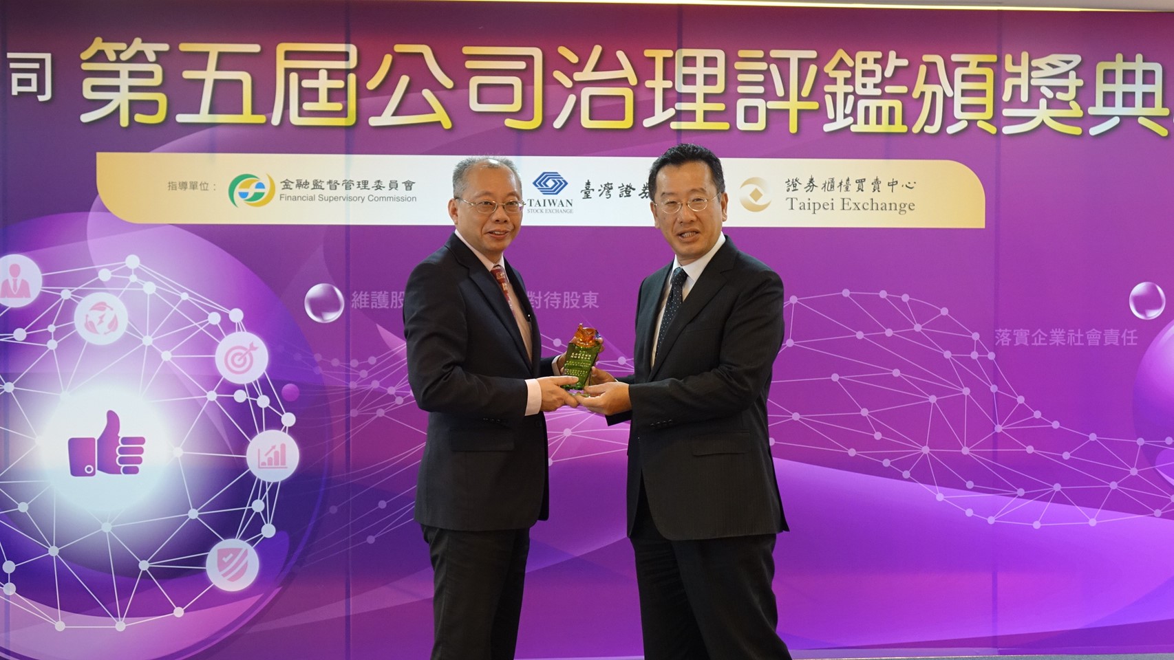 The TWSE and TPEx launched“Corporate Governance Evaluation System”, conducted by the Securities and Futures Institute (SFI) to evaluate the performance of corporate governance among listed companies. The evaluation indicators comprise the 6 categories and 99 indicators: protecting shareholder rights and interests, treating shareholders equitably, enhancing board composition and operation, increasing information transparency, putting corporate social responsibility into practice, and others.