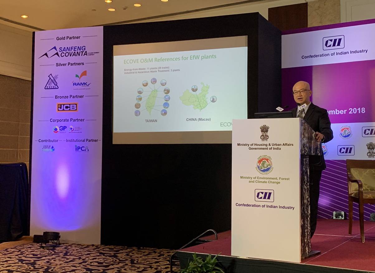 - 2018/11/30ECOVE Delivers Speech on “Intelligent Operation Management of EfW Plants” to India Waste ConferenceECOVE is the largest environmental resource management company in Taiwan. Among the 24 EfW Plants in Taiwan, over 2/3 are managed by ECOVE providing services in Operations and Maintenance, Commissioning, Revamping and Overhaul, and Upgrade and Improve Systems and Equipment. ECOVE's successful experience in the treatment of wastes was appreciated by Confederation of India Industry(CII)and has been invited to the “International Conference on PPP Model for Waste To Worth Projects” to deliver a speech.